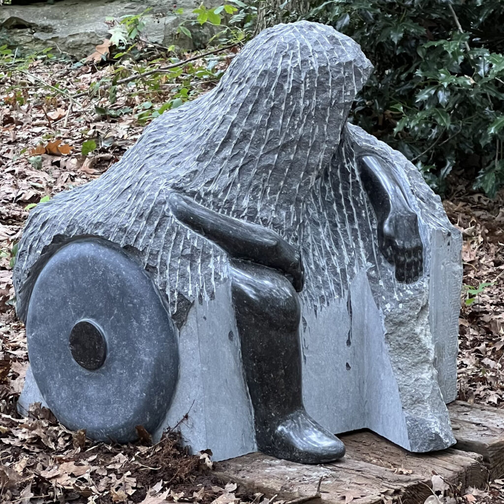 Eensklaps, op 6 juni 2024, duikt in mijn hoofd een gedachte op, een beeld, ik weet niet waarvandaan. Ik haal bij de buurvrouw (keramiste Dorothé Vrijdag) een klompje klei en op 7 juni krijgt het model in een uurtje vorm. Pas enkele weken later wordt de oorsprong van dit idee me duidelijk. Van een fors blok arduin op Lux et Terra klief ik een brok van ca 70 x 80 x 90 cm. Vanaf het eerste begin is het me duidelijk dat ik het oorspronkelijk gebruik van dit blok, onderdeel van een sluiswerk waarin de sluisdeur draaide, herkenbaar wil bewaren. Een rond geslepen stuk onyx vult het vierkante gat waarin een dook destijds stevigheid aan de constructie gaf. De ekster op het onyx refereert aan een strofe uit ‘Kentucky Avenue’ van Tom Waits: